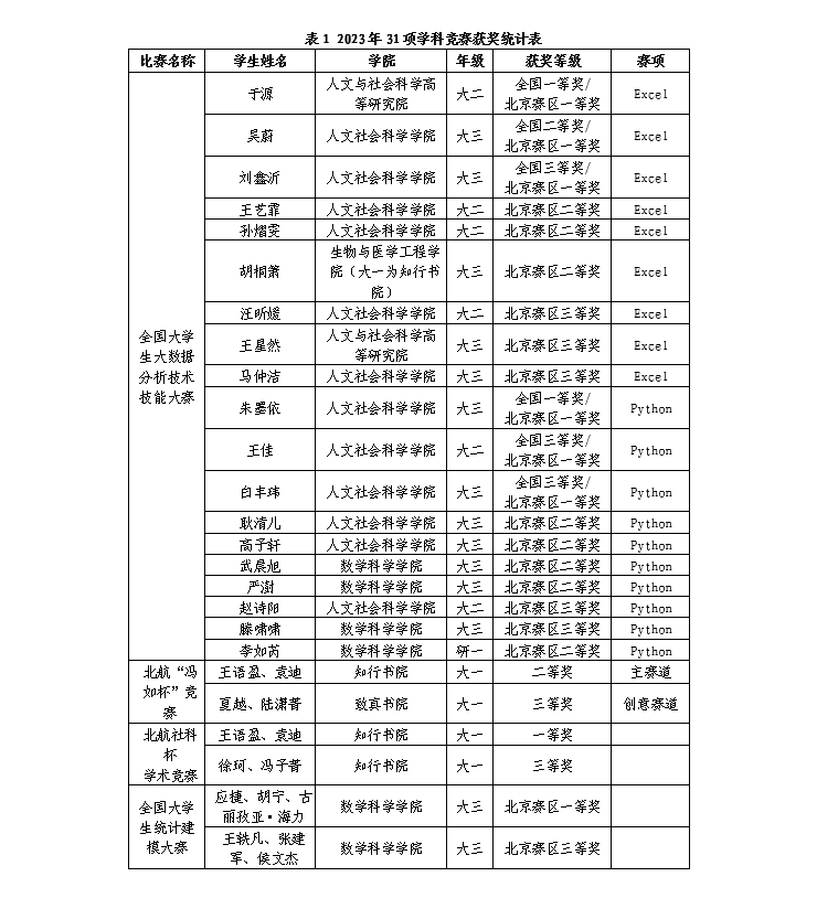 通过“冯如杯”、“统计建模大赛”、“大数据分析大赛”等学科竞赛,北航学子展现出了卓越的统计能力和综合素养,也激发了他们运用统计方法和大数据技术解决实际问题的热情。学科竞赛成果展示了太阳成集团122ccvip的校级一流本科课程《回归分析》《统计学导论》等统计课程的教学成果和育人成效,有力地支持了统计学国家级一流本科专业建设点和北航新文科的建设。