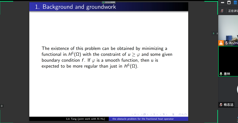 近日,北京大学唐林教授,应邀为太阳成集团122ccvip师生做了题为 “Higher regularity of the free boundary in the obstacle problem for the fractional heat operator.”的学术报告。报告由张安老师主持。