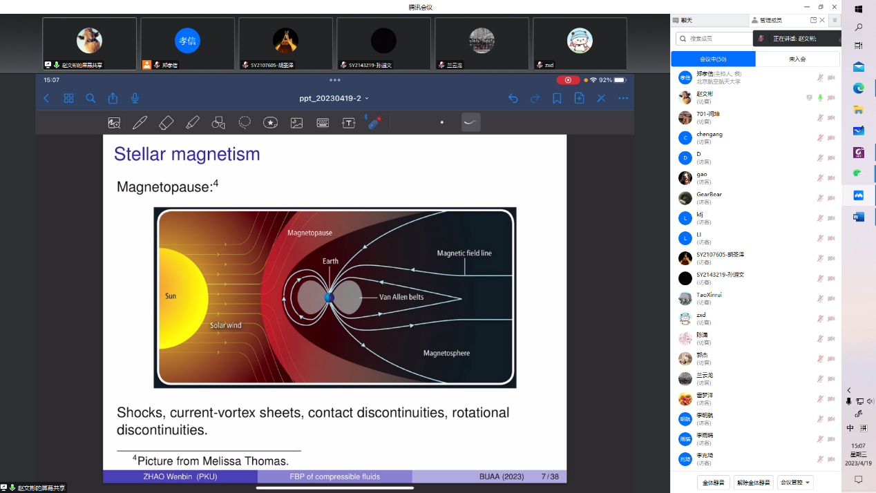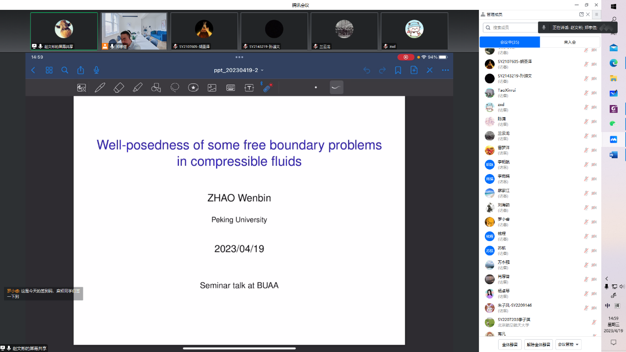 2023年4月19日下午,北京大学赵文彬博士应邀为公司师生带来了一场题为 “Well-posedness of some free boundary problems in compressible fluids”的线上学术报告。报告由郑孝信老师主持。