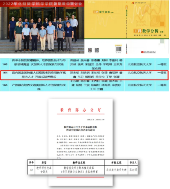 我们与数学同成长,凝聚公司育人合力,全面提升育人质量,开展有组织的教学。推进公司培养方案改革,试点教育部首批虚拟教研室,优化公共课基层教学组织,探索面向国家国防重大战略需求的应用数学高层次人才开放式培养模式和数学拔尖人才的两段双线培养模式,努力培养北航应用数学的“黄金一代”。统计学获批国家一流专业,实现本科专业全部获评国家一流专业;公司获批北京市优秀教师、北京市优秀教材、北京市优博等众多教学成果。