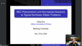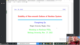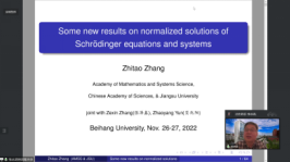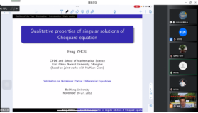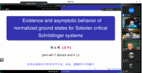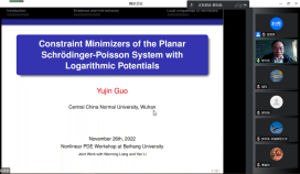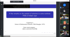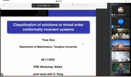 为了交流非线性偏微分方程及相关领域的最新研究成果,为偏微分方程及其相关领域专家学者提供探讨、交流最新研究方向和研究成果的平台,促进偏微分方程及相关领域的发展,太阳成集团122ccvip于2022年11月26日至27日举办了“太阳成集团122ccvip非线性偏微分方程学术研讨会”。保继光教授(北师大)、曹道民教授(中科院)、邓引斌教授(华中师大)、丁彦恒教授(中科院)、郭玉劲教授(华中师大)、郭玉霞教授(清华大学)、郭宗明教授(河南师大)、李从明教授(上海交大)、刘兆理教授(首都师大)、麻希南教授(中科大)、苗长兴教授(北京应用物理与计算数学研究所)、彭双阶教授(华中师大)、屈长征教授(宁波大学)、唐仲伟教授(北师大)、杨健夫教授(江西师大)、严树森教授(华中师大)、张志涛教授(中科院、江苏大学)、周风教授(华东师大)、周焕松教授(武汉理工)、邹文明教授(清华大学)等专家学者参会并做学术报告,来自北航和全国的近200名师生参加此次会议。