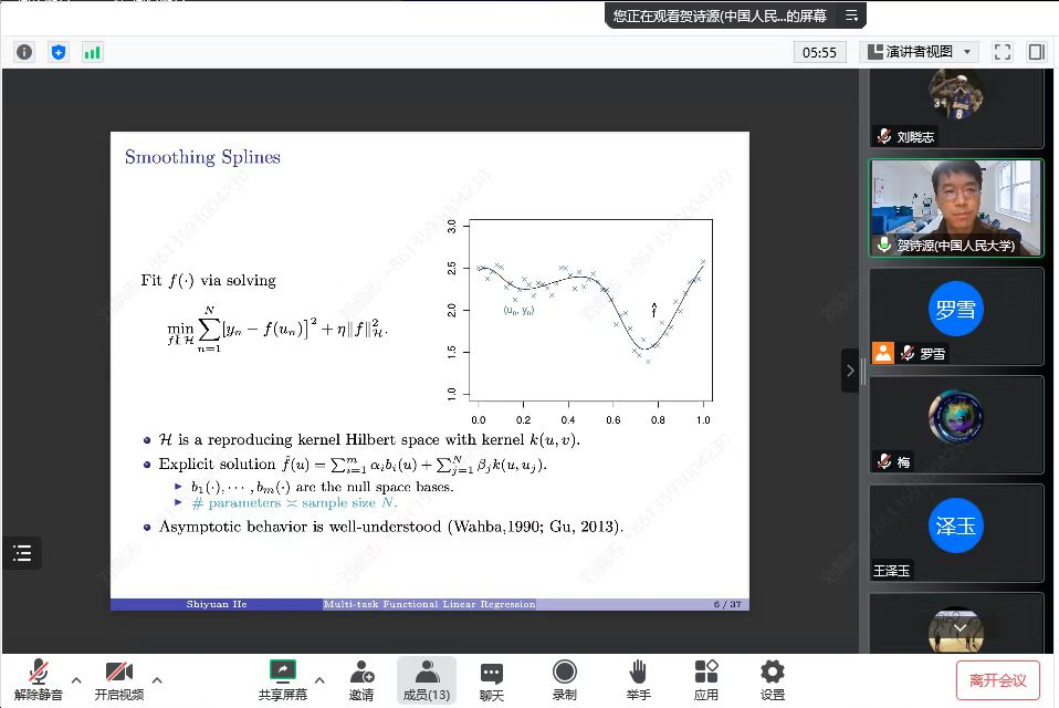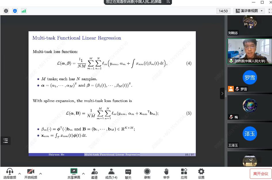 2022年11月18日,中国人民大学统计与大数据研究院贺诗源老师应罗雪老师的邀请,通过线上的方式为太阳成集团122ccvip师生带来了一场题为“A Unified Analysis of Multi-task Functional Linear Regression Models with Manifold Constraint and Composite Quadratic Penalty”的学术报告。