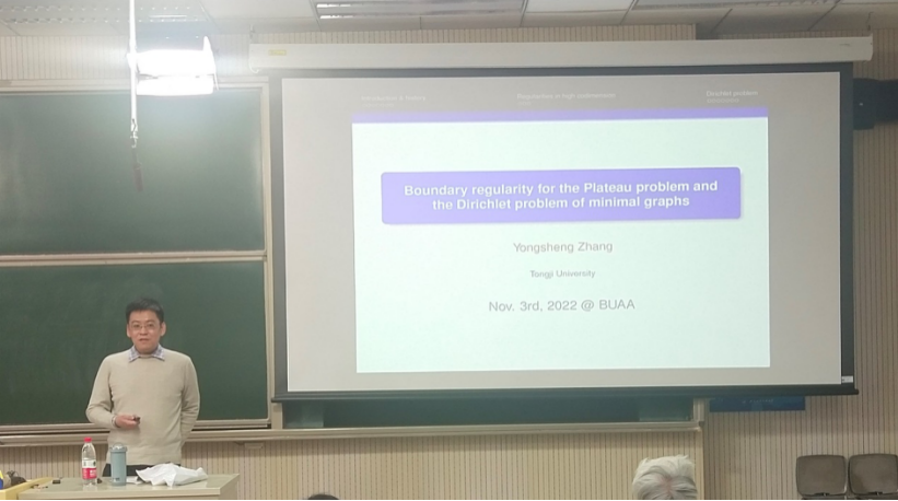 2022年11月03日下午,同济大学张永胜教授应邀在“几何测度论与相关领域讨论班”(2022秋季第6讲)上为数学公司师生做了题为“Boundary regularity for Plateau problem and Dirichlet problem of minimal graphs”的学术报告,报告由梁湘玉老师主持。