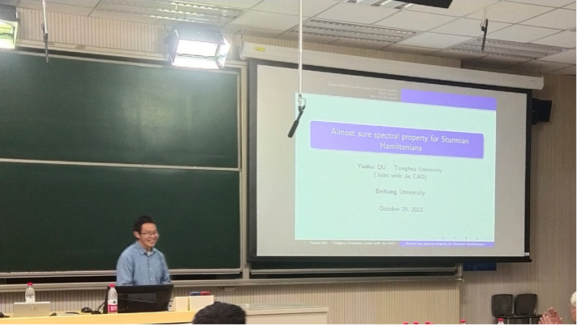 2022年10月20日下午,清华大学瞿燕辉副教授应邀在“几何测度论与相关领域讨论班”(2022秋季第4讲)上为数学公司师生做了题为“Almost sure spectral properties for Sturm Hamiltonian”的学术报告,报告由梁湘玉老师主持。