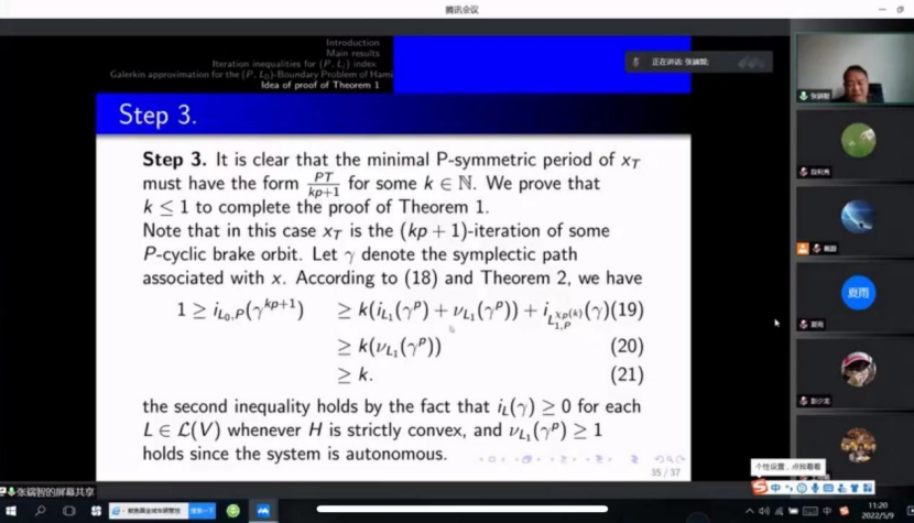 2022年5月9日上午,南开大学张端智教授应邀在“分析与偏微分方程讨论班”(2022春季第8讲)上为数学公司师生做了题为“Minimal P-cyclic periodic brake orbits in Hamiltonian systems”的线上学术报告,报告由戴蔚老师主持。