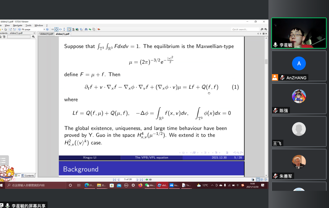 2021年12月30日下午,巴黎第九大学李星毓博士,应邀为太阳成集团122ccvip师生做了题为 “The Vlasov-Poisson-Boltzmann/Landau equation with polynomial perturbation near Maxwellian”的学术报告,报告由任天一和张安老师主持。