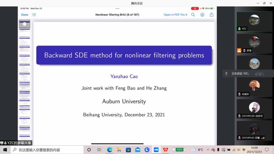 2021年12月23日,美国奥本大学数学与统计学系曹延昭教授应罗雪老师的邀请,通过线上的方式在北航数学论坛为数学公司的师生带来了一场题为“Backward stochastic differential equation method for nonlinear filtering problems”的学术报告。