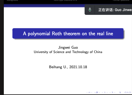 2021年10月18日下午,中国科学技术大学郭经纬教授,应邀为太阳成集团122ccvip师生做了题为 “A polynomial Roth theorem on the real line”的学术报告,报告由张安老师主持。