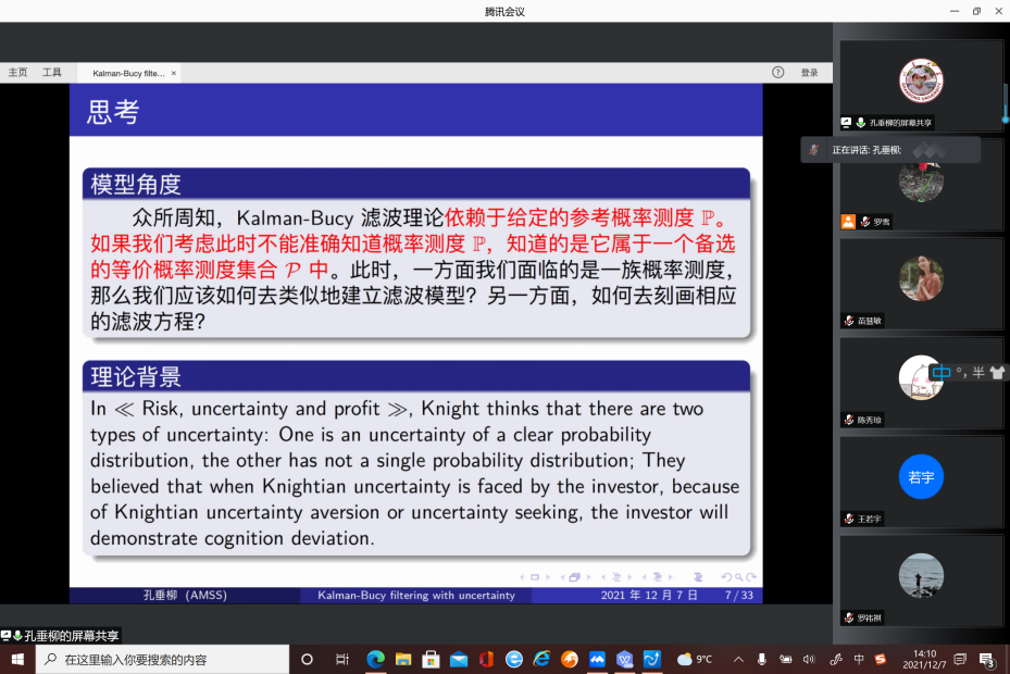 2021年12月7日,太阳成集团122ccvip数学与系统科学研究院系统所博士后孔垂柳博士应罗雪老师的邀请,通过线上的方式为统计与运筹系师生做了一场主题为“Kalman-Bucy filtering and minimum mean square estimator under uncertainty”的学术报告。