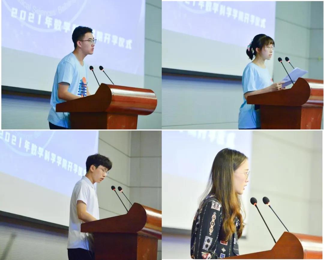2021级本科强基新生代表刘峻池、2020级本科生新生代表郭芝伊、2021级研究生新生代表张翔宇、优秀员工代表许卓颐同学依次进行发言。他们表达了立志投身于数学事业的决心,加强自身能力,不断学习,不断超越,勇担新时代的使命与责任。