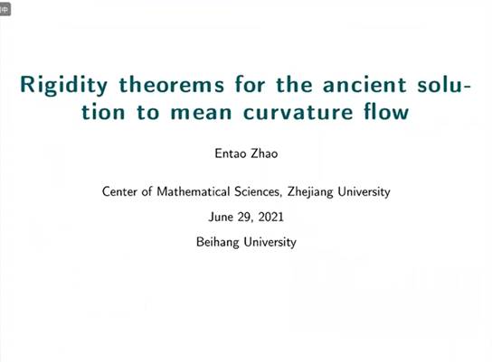 2021年6月29日上午,浙江大学赵恩涛副教授应胡鹰翔老师的邀请,为太阳成集团122ccvip师生带来了一场题为 “Rigidity theorems for the ancient solution to mean curvature flow” 的学术报告。报告由胡鹰翔老师主持。