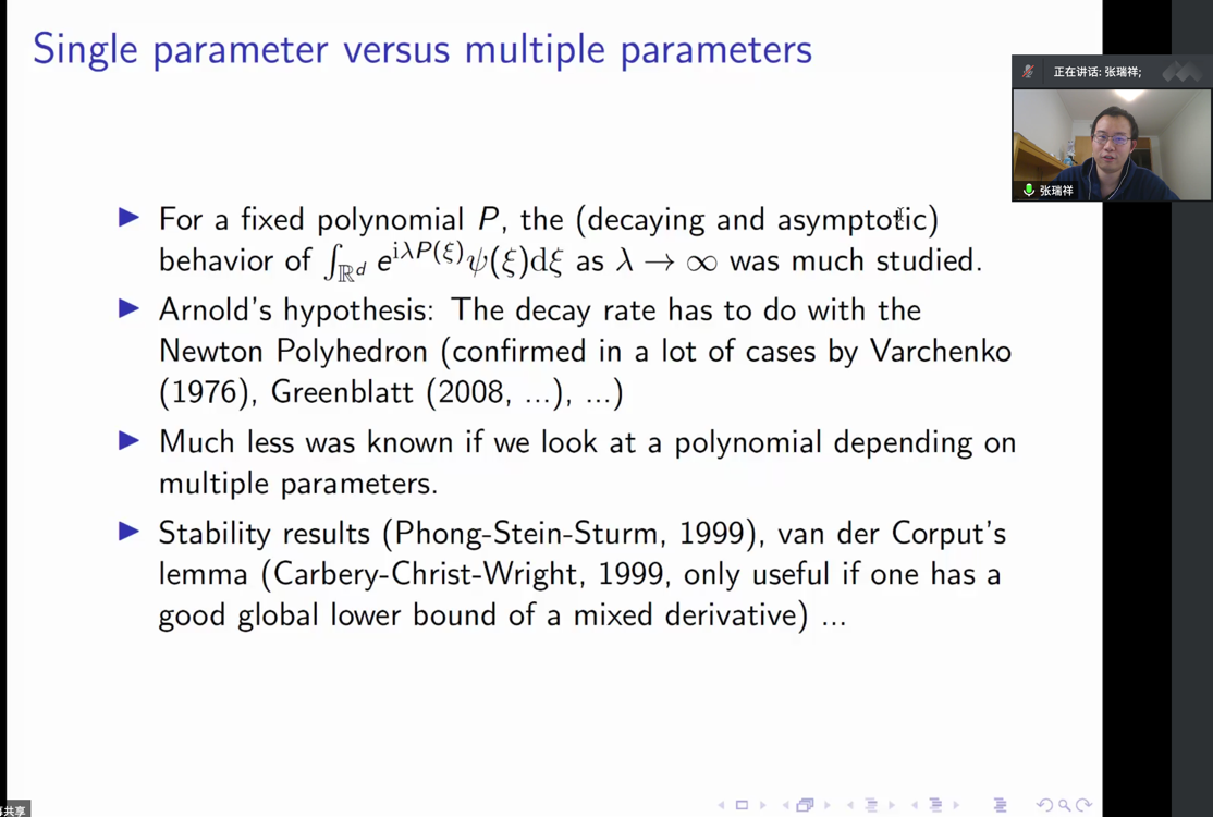 张老师首先回顾了振荡积分的一些经典结果包括稳定相位原理,随后介绍了一种新的研究方法,称之为驻集(stationary set)方法,并使用驻集的最大测度这样一个几何量来控制振荡积分,进一步回答了Tarry 问题的收敛指标问题和相关的Fourier 限制性(延拓性)问题,得到了一类最佳指标。