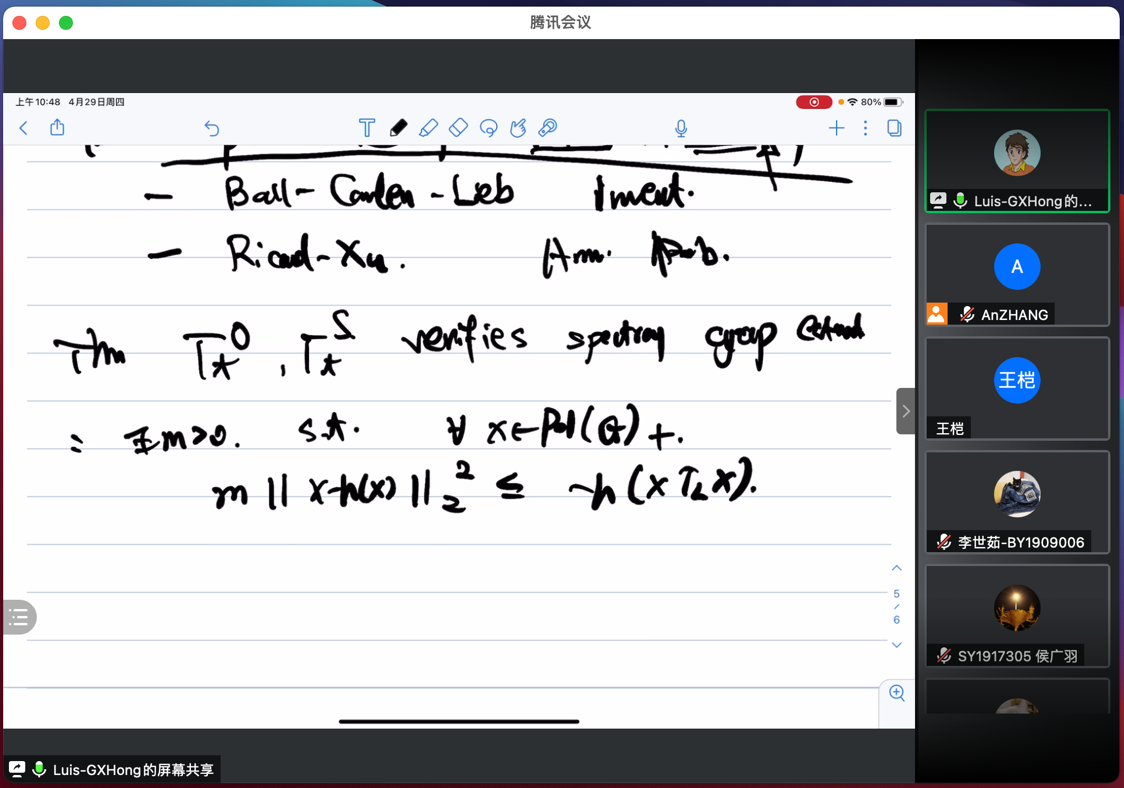 2021年4月29日,武汉大学洪桂祥教授受邀为太阳成集团122ccvip师生做了题为“Hypercontractivity of heat semigroups on free quantum groups”的线上学术报告,报告由张安老师主持。