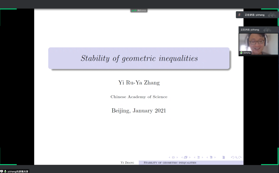 2021年1月13日下午,中科院数学所张翼副研究员,应邀为太阳成集团122ccvip师生做了题为“Stability of geometric inequalities”的线上学术报告,报告由张安老师主持。