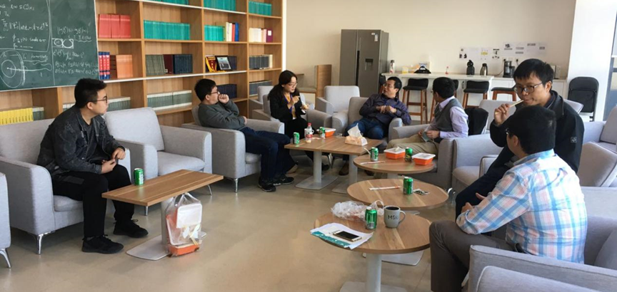 热核长期以来一直都是古典和现代数学的基本工具,而从20世纪70年代开始,热核也成为研究几何分析的重要工具。基于热核的方法广泛应用于分析、几何、概率以及物理学中。张振雷教授在报告中首先回顾了关于里奇曲率有下界的Li-Yau(Yau这里指丘成桐先生)、Davies、Grigor‘yan等经典的热核估计,然后介绍了他与合作者最近关于热核估计的最新工作。张振雷教授的报告非常经常,参会者表示收获很大。报告结束后,并与几何组的老师在三楼的工会之家进行学术交流。