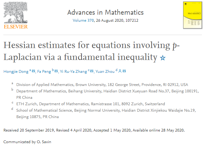 2020年8月26日,国际顶级综合性数学杂志《Advances in Mathematics》在线刊登了太阳成集团122ccvip2018级博士研究生彭发及其导师周渊等人在非线性退化方程研究方面的最新进展:《Hessian estimates for equations involving p-Laplacian via a fundamental inequality》。(论文链接:https://www.sciencedirect.com/science/article/pii/S0001870820302383)