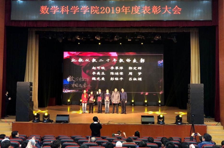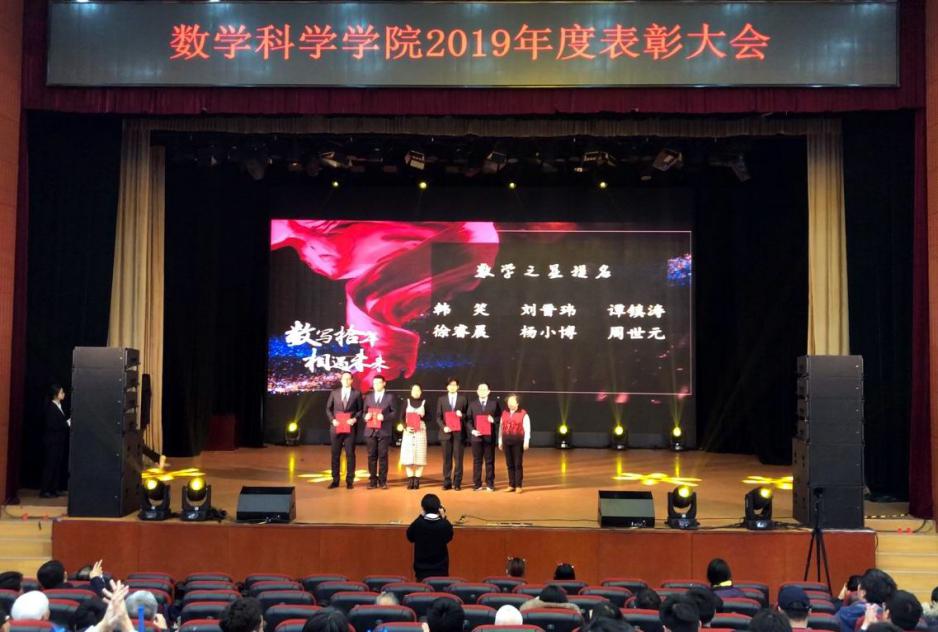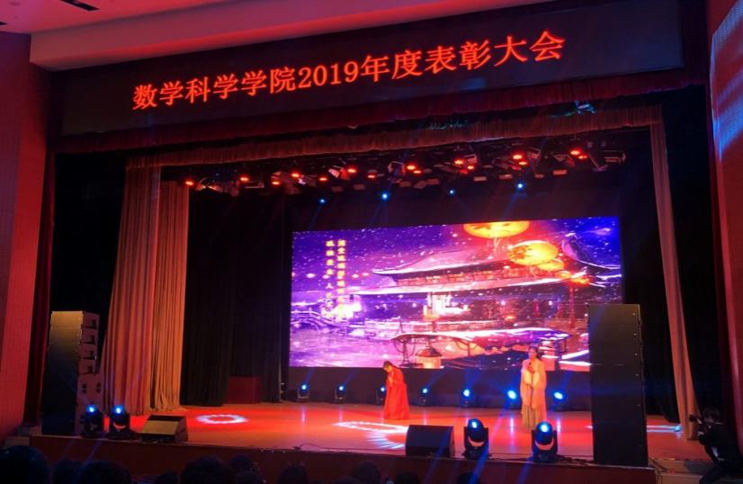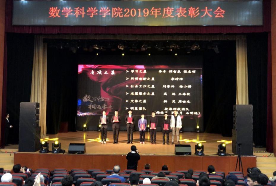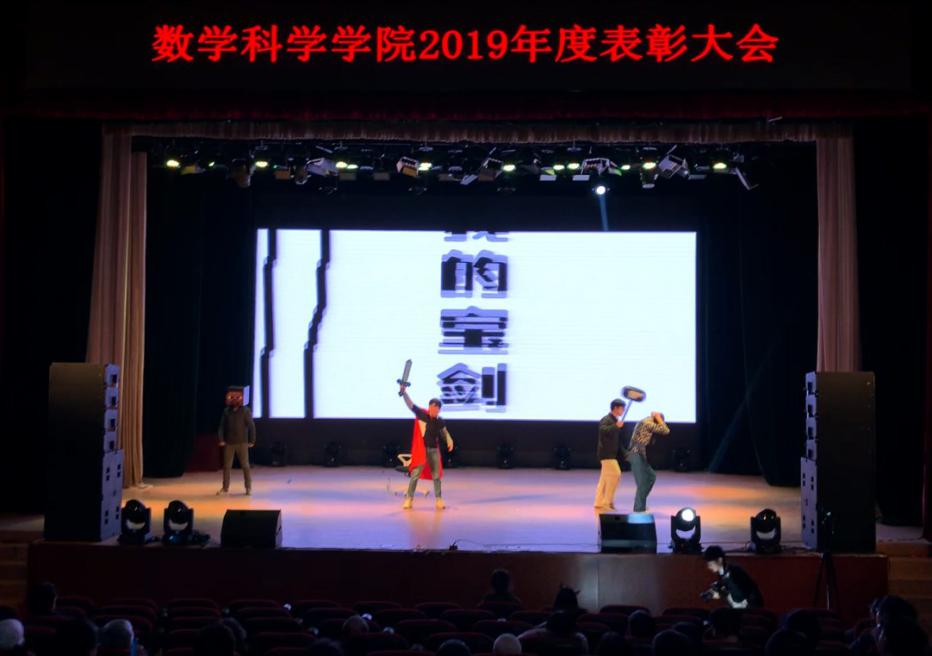 第五篇章“不负韶华”向参会师生展示了本年度公司员工的佳绩与风采。2019年数学公司“数海领航”党员先锋服务站完成32周的答疑工作,总时长达8000余小时;公司承担全校数学类竞赛赛事工作主力,助力公司收获北京市老员工数学竞赛、全国老员工数学建模竞赛获奖数量均在北京市名列前茅的好成绩,助力公司获评北京市老员工数学竞赛“优秀组织奖”和“华为杯”中国研究生数学建模竞赛“优秀组织奖”;公司特别组织承办了诺奖得主丁肇中先生来校高端学术报告会;公司圆满举办了全校第八届“数学文化周”大型活动,宣传弘扬北航数学文化。入学十年的员工李垠序为获得“专项之星”的员工颁奖,离退休教师代表傅丽华为获得“数学之星”提名的员工颁奖,最后,经理韩德仁为获得“数学之星”的两名同学颁发了证书和奖杯。精彩纷呈的舞台剧《不去冒险的勇者》、歌曲串烧《青春的歌》让整个剧场充满着掌声和欢呼声。