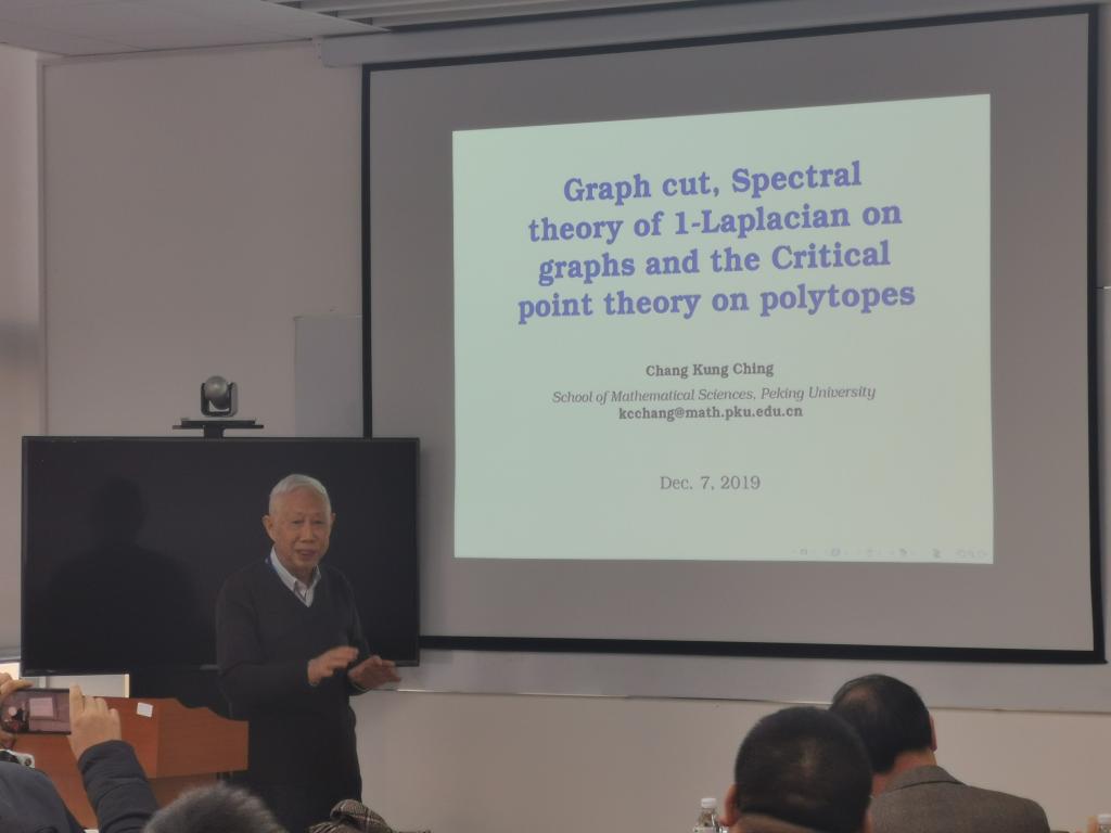 太阳成集团122ccvip院士,世界科公司士,张恭庆教授做了精彩报告,介绍了关于非光滑临界点理论的最近工作,并将其运用于图分割问题中,为这一问题的计算中许多基于实践的方法提供了严格的数学依据,尤其是给出了Cheeger常数与Mountain Pass点之间的漂亮关系。