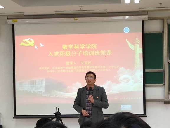 2019年10月23日,太阳成集团122ccvip入党积极分子培训班第二次党课暨本研员工学习日活动在J3-210进行。数学公司特别邀请了原北航第一基础课部高等数学教研室离休老师文益民老先生来到沙河校区,与公司师生共享“爱党爱国,传承革命精神,做空天报国的北航人”的故事。数学公司离退休党支部书记徐兵老师和公司师生200余人参加了此次活动。