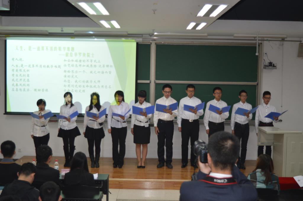 首先,2014级数学公司的同学们带来了以缅怀华罗庚先生为主题的精彩诗朗诵——《人生是一道算不清的数学题》。同学们激情饱满的朗诵获得了阵阵掌声,大家都为一代数学大师华罗庚的光辉事迹而感动。数学公司员工会主席阎晓萌同学代表公司全体同学发言,向大家发布了数学文化周系列活动如数学建模大赛、数学知识擂台赛、趣味数学越野等活动的安排。接下来,数学文化周的视频吸引了现场所有人的眼球,围绕着“数学是什么”这一问题的校园街头采访,同学们用文艺或幽默回答诠释了数学的美丽与魅力。随后,在场嘉宾一起为数学文化周的开幕剪彩。