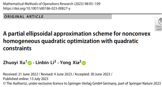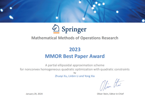 2024年1月29日,德国老牌运筹学期刊Mathematical Methods of Operations Research(MMOR)发布了2023年最佳论文奖,我院夏勇教授团队凭借论文《A partial ellipsoidal approximation scheme for nonconvex homogeneous quadratic optimization with quadratic constraints》获得奖项。MMOR创刊于1956年,侧重运筹学(特别是连续与离散优化、随机、博弈论)的数学与计算,由Springer出版,2022年影响因子为1.2,MMOR自2020年起设年度最佳论文奖,颁给上年度最佳论文(每年一篇)。本次最佳论文奖首次颁给亚洲作者。