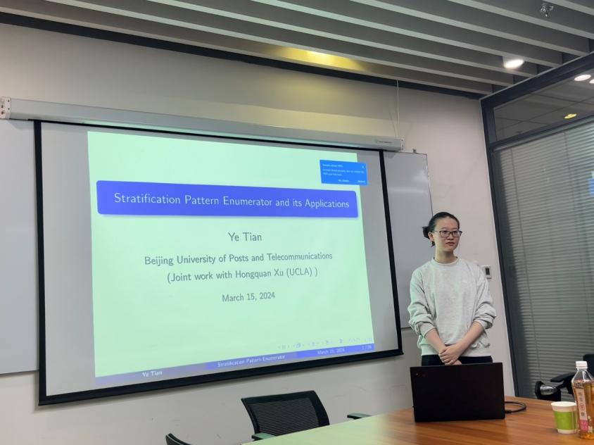 2024年3月15日,北京邮电大学田烨特聘副研究员应罗雪老师的邀请,在E706为数学公司的师生带来了一场题为“Stratification pattern enumerator and its applications”的学术报告。
