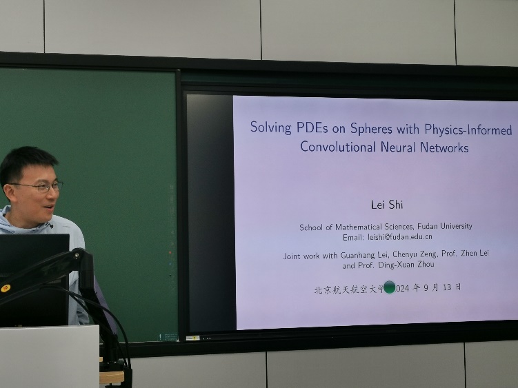 石磊教授的报告题目为“Solving PDEs on Spheres with Physics-Informed Convolutional Neural Networks”。物理信息神经网络(PINNs)已被证明是有效的求解偏微分方程(PDEs)从各种实验的角度,最近的一些研究也提出了球面上偏微分方程的PINN算法,然而对pinn特别是在球面或流形上的数值表现的理论分析仍然缺乏。石教授在报告中介绍了他与合作者的工作,特别是建立了对求解球面上偏微分方程的物理信息卷积神经网络(PICNN)的严格分析,通过利用深度卷积神经网络和球调和分析的最新逼近结果,证明了相对于Sobolev范数的逼近误差的一个上界。进一步将其与创新的定位复杂性分析相结合,以建立PICNN的快速收敛速度。理论结果得到了数值实验的验证。