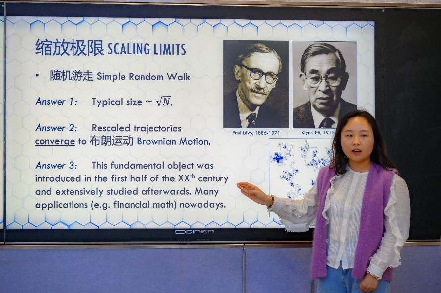 此次报告主题是统计物理中临界点附近格点模型的缩放极限。在报告中,万艺君从动机、离散格点模型、连续模型和二者之间的关联四部分进行介绍。万艺君首先用大家耳熟能详的模型,如随机游走和自避游走模型,引起大家兴趣;随后自然地引入一些统计物理学中的概念和更深刻的数学工具,由表及里,深入浅出。在场同学跟随她的思路,逐步领略她所述各类模型之精巧,兴趣盎然。在报告的最后,她鼓励同学们以兴趣为导向去探索更多研究方向,并对于如何探索新方向给出了具体的建议。