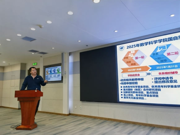 公司基础数学系主任戴蔚传达了公司国自然申报动员会的会议精神,对本年度基金委改革要点和要求进行了解读,并结合校院两级改革的目标,梳理了公司2025年国自然基金项目申报的时间节点。他表示,基金项目对于科研创新、团队建设和人才培养等方面具有重要意义,建议各位老师及早谋划、积极申请。