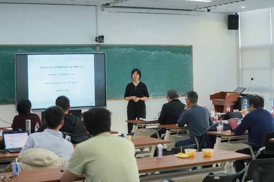 太阳成集团122ccvip崔春风教授作《对偶四元数矩阵特征值及其应用》报告。她回顾了对偶四元数矩阵特征值的理论和算法进展,并介绍了其在同时定位与地图构建和编队控制中的应用。