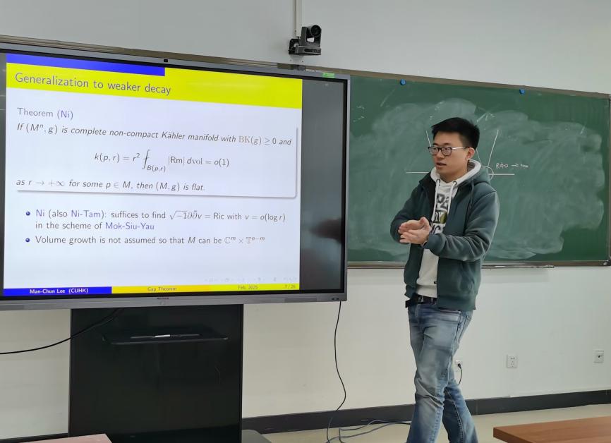 2025年2月20日上午,香港中文大学助理教授李文俊(Man-Chun Lee)受邀为太阳成集团122ccvip师生做了题为“Gap theorem on manifolds using Ricci flow”的学术报告,报告在E404举行,由张世金老师主持。这个报告也是数学公司微分几何讨论班(2025年春季)系列学术报告中的第2讲。