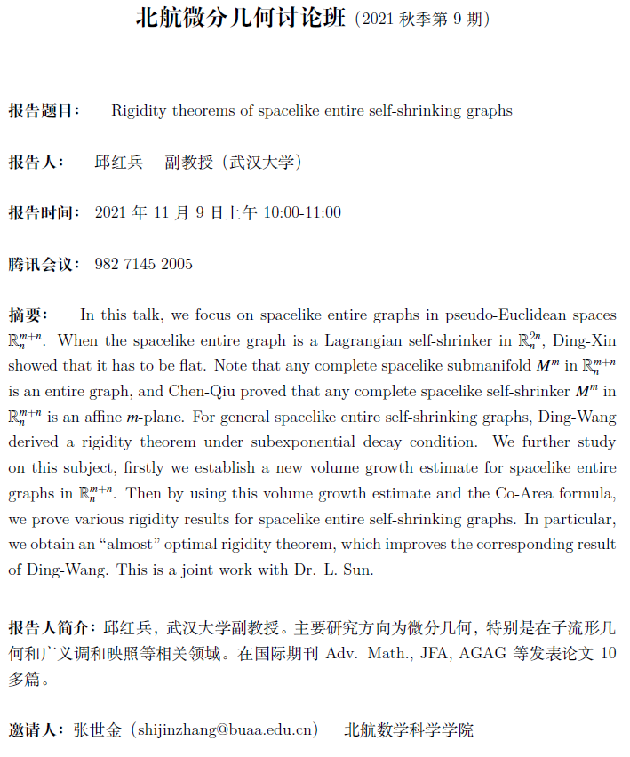 【学术报告及微分几何讨论班(2021秋季第9讲)】Rigidity theorems of spacelike entire self-shrinking graphs